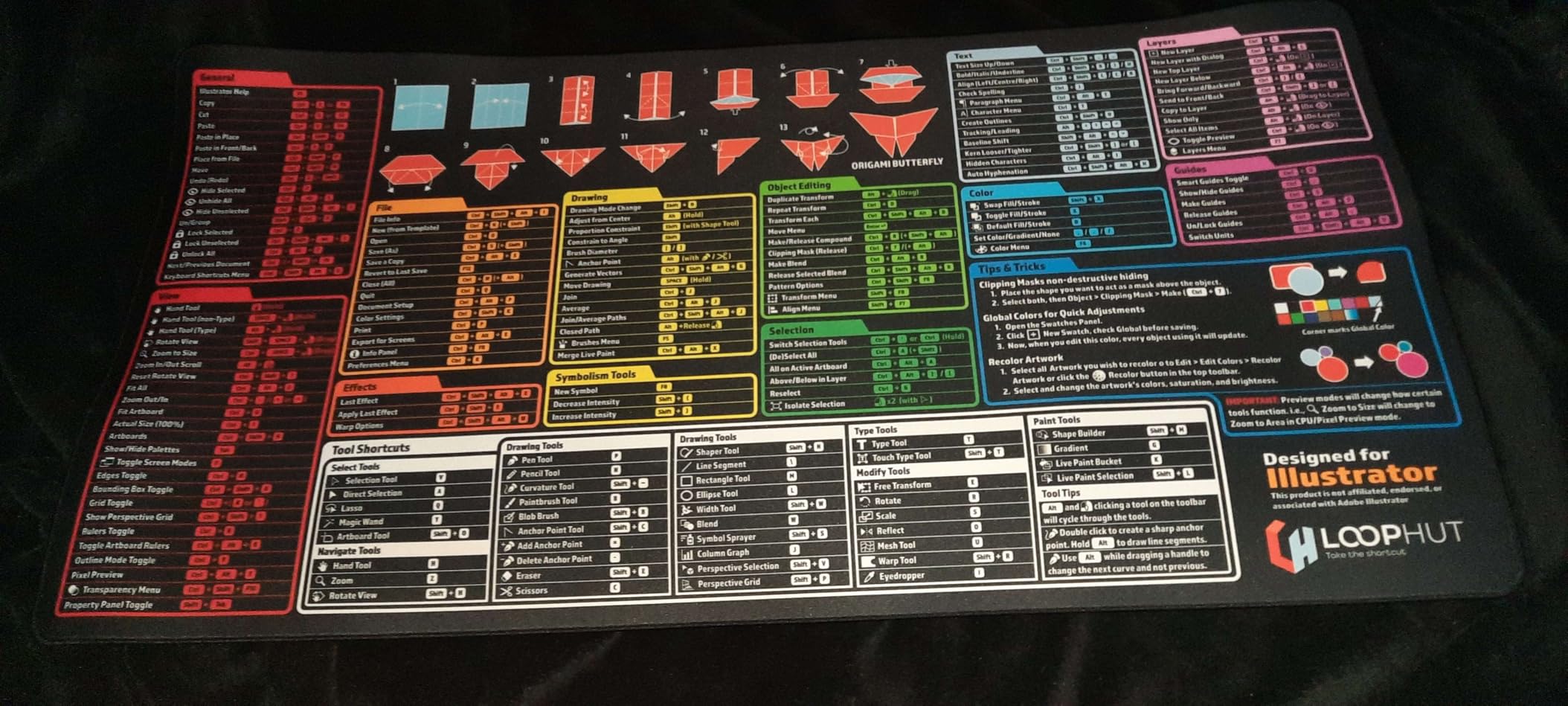 This large mat has been a brilliant workspace enhancement. It provides a huge, smooth area that's ideal for the precise mouse movements needed in vector work. The surface allows for excellent tracking. The key feature, the printed list of shortcuts, has proven to be incredibly useful. I have my standard set of go-to commands, but this mat acts as a constant, passive learning tool. I've found myself naturally incorporating new and more efficient shortcuts into my work, which has been a welcome productivity boost. The text is sharp and easy to read. It's a simple idea, but it combines a quality work surface with a practical reference guide that I now use all the time.
